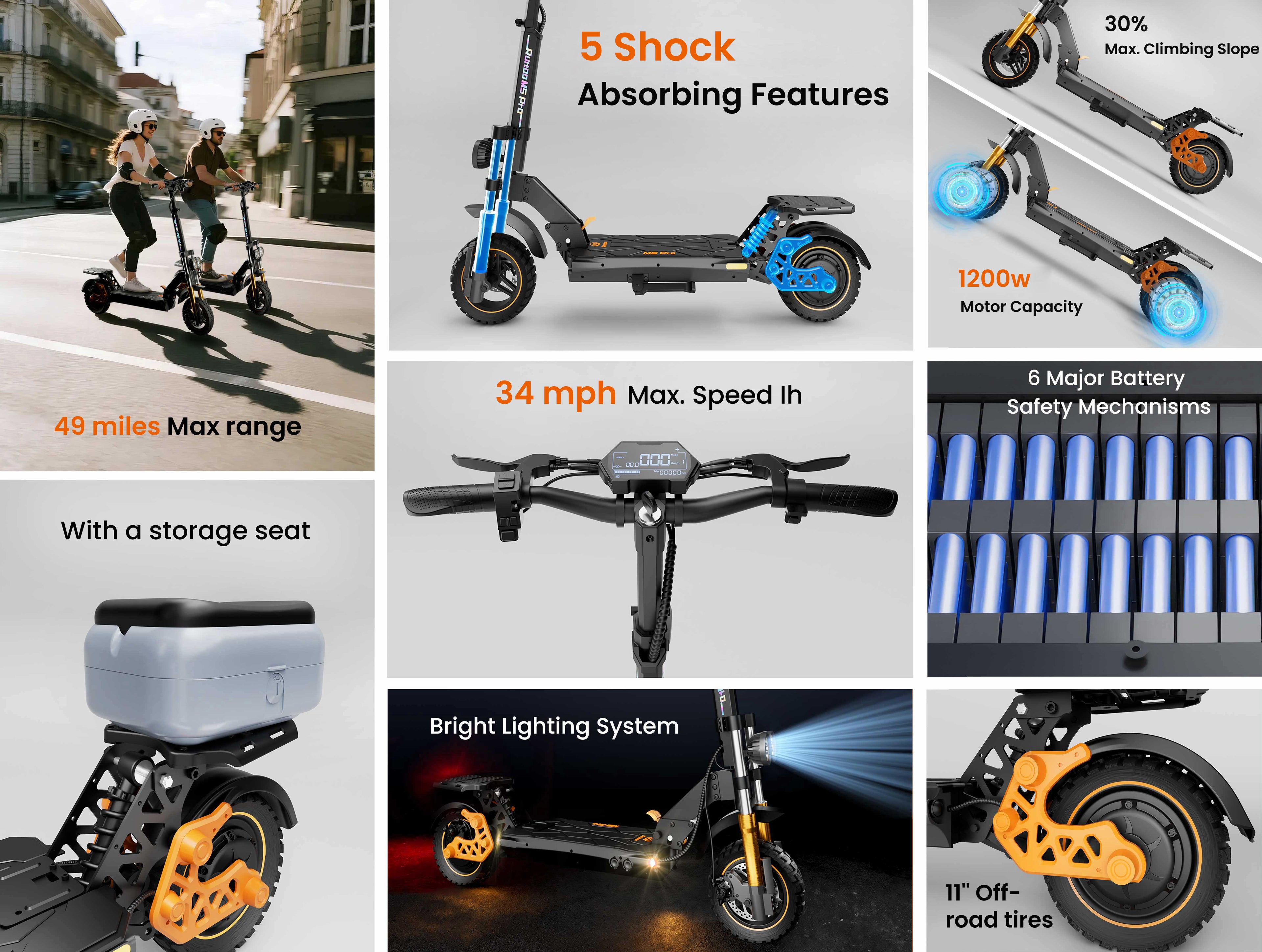 Equipped with 10-inch and 11-inch off-road tires, designed for durability and stability on all terrains.